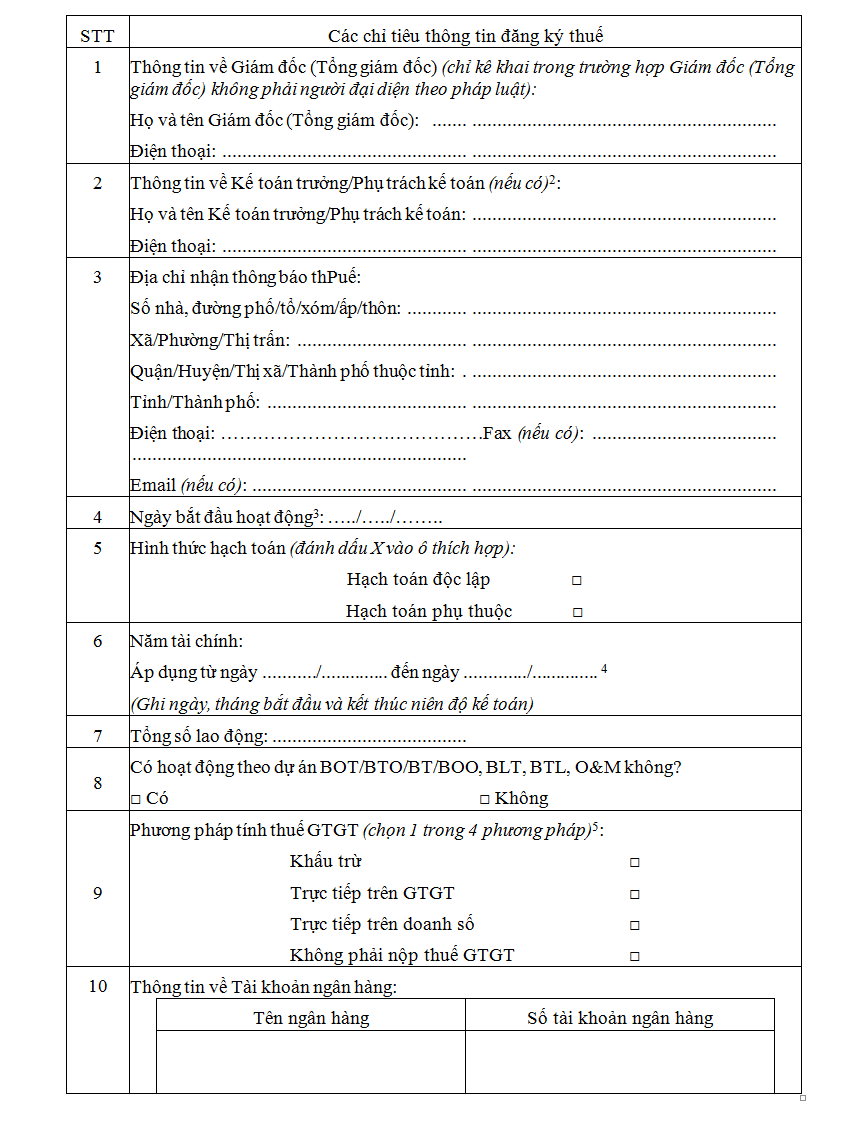 2. Trường hợp doanh nghiệp kê khai hình thức hạch toán là Hạch toán độc lập tại chỉ tiêu 5 thì bắt buộc phải kê khai thông tin về Kế toán trưởng/phụ trách kế toán tại chỉ tiêu 2.