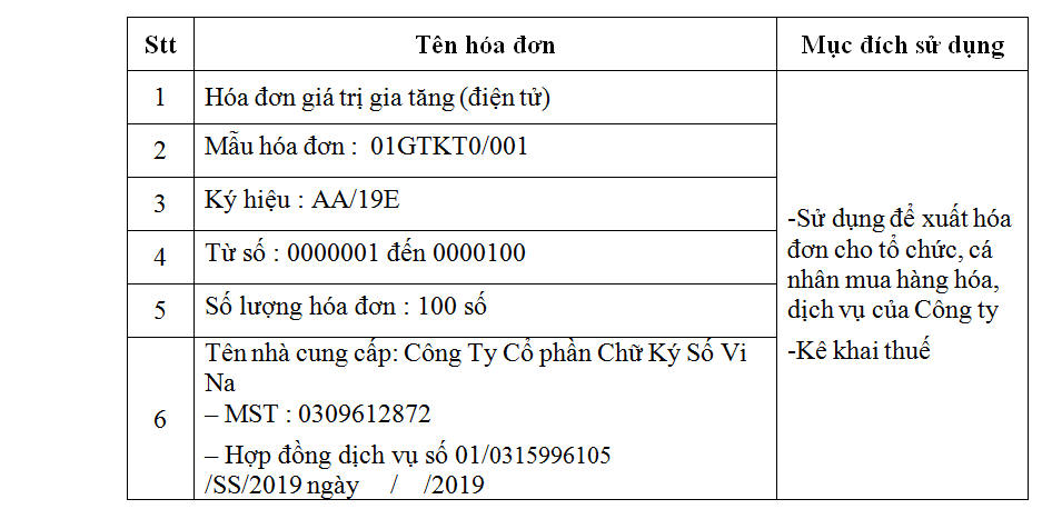 - Tên nhà cung cấp phần mềm Hoá đơn điện tử: Công Ty Cổ phần Chữ Ký Số Vi Na - Mã số thuế: 0309612872